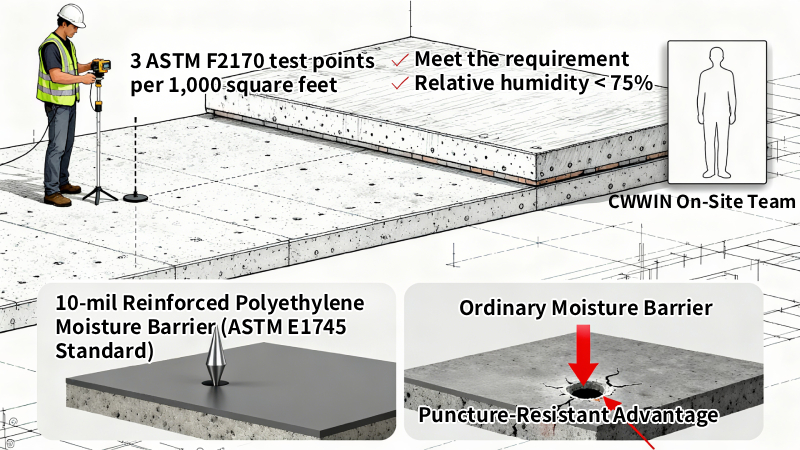 • Conduct thorough slab testing (3 ASTM F2170 locations per 1,000 sq. ft.), as failed tests account for 60% of moisture-related issues. Ensure slab RH meets the <75% pre-installation requirement (detailed in Chapter 3). For Asian clients, CWWIN’s on-site team supports this step.