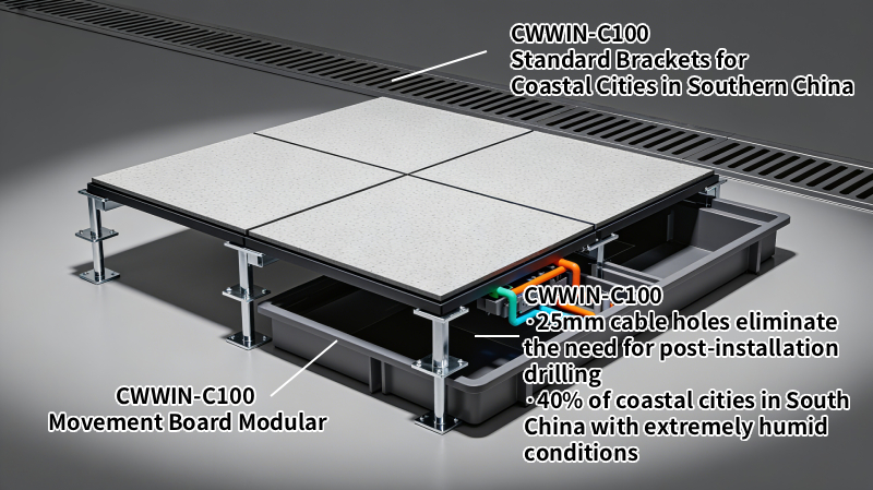 The CWWIN-C100’s raised structure (combining panels, pedestals, and under-floor cavities) reduces condensation by 40% when paired with proper ventilation (per USGBC data). Pre-drilled 25mm cable holes eliminate post-installation drilling— a common source of moisture entry. For extreme humidity areas like South China’s coastal cities, the system is compatible with industry-standard drainage-groove pedestals to further manage moisture.