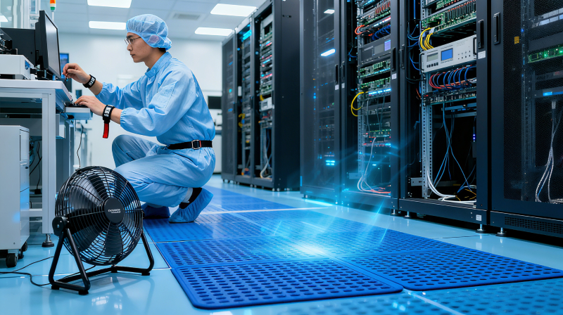 Ionizers neutralize static by releasing positive/negative ions into the air, which works for hard-to-reach areas (e.g., inside server racks). But they lack the consistency of grounded ESD flooring and often require pairing with it to meet compliance standards: